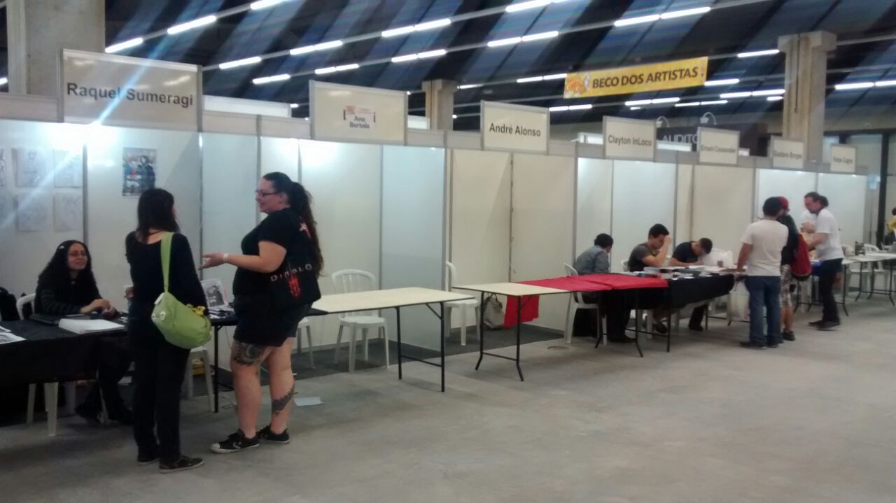 “Dentro dos meus objetivos, não foi sensacional, mas também ficou longe de ruim”, nos conta Emílio Baraçal, editor e roteirista que aproveitou a convenção para dar ao público o primeiro gosto da linha de HQs da Supernova Produções – e isso diretamente no Beco dos Artistas. “Como a revista ainda estava rodando na gráfica, assim como as canecas e camisas, não tínhamos nada pra vender lá. Então, nosso objetivo foi apenas mostrar nossa cara, mostrar nossa existência. Não era vender. Boa parte do que ficou nas mesas eram os originais do que estamos produzindo, ou seja, não é material de venda. Era pro povo perguntar e saber mais. Teve momentos em que nossas mesas ficavam lotadas e a mesa do Arthur Suydam, por exemplo, ficava vazia. E é o Suydam [que contribuiu com revistas como a Heavy Metal e fez as capas de Zumbis Marvel]!”.
