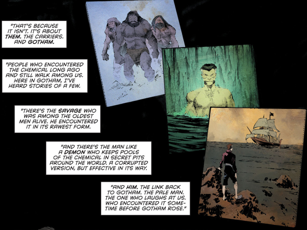 Há outra explicação. Em certo momento, Dekker se refere aos “Transportadores. E Gotham. Pessoas que encontraram esta química anos atrás e ainda andam entre nós. Aqui em Gotham eu ouvi histórias de alguns. Há um selvagem que é praticamente o homem mais velho vivo. Ele encontrou isso na forma mais crua. E o outro é um homem como um demônio que mantém piscinas com o químico ao redor do mundo. Uma versão corrompida, mas efetiva da sua forma. E ele. A ligação com o passado de Gotham. O homem pálido. O homem que ri da gente. Que o encontrou algum tempo antes de Gotham ascender”.