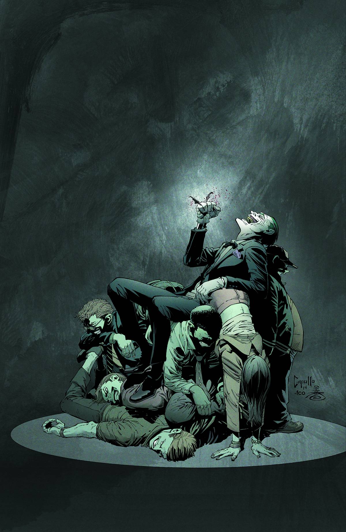Batman #38Snyder e Capullo já haviam dado uma boa atenção ao vilão no arco Morte da Família, aquele no qual o Coringa transforma o próprio rosto arrancado em uma máscara e passa a atacar os personagens de apoio do Morcegoman, tudo pra provar (basicamente) que eles o deixam fraco, já que o principal objetivo dele como vilão é deixar o herói mais forte e torná-lo um adversário digno. Depois, no grande (em tamanho e de qualidade, diga-se) arco Ano Zero, os dois estabelecem a Gangue do Capuz Vermelho – cujo líder, o Capuz Vermelho Um, cai num tonel de produtos químicos. Era a origem do Coringa recontada. Aparentemente.