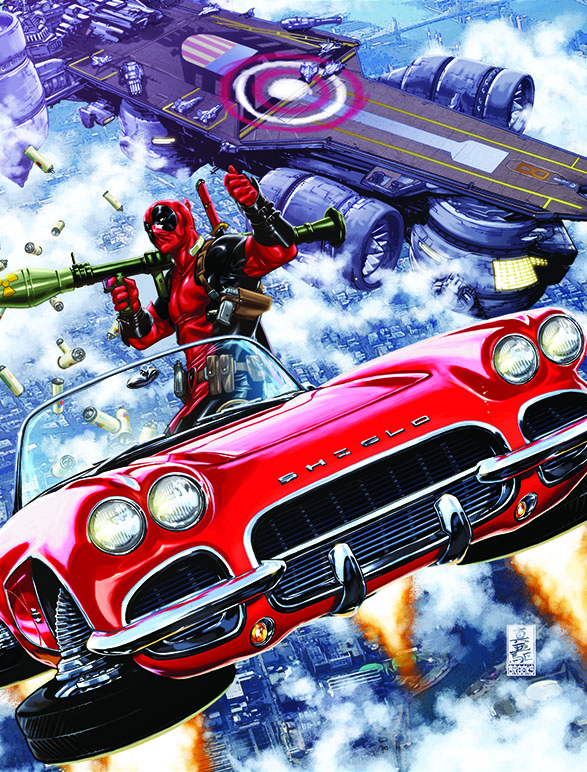 Na arte das páginas internas, Mark Brooks manda muito bem, misturando ação com um traço limpo e acertado na hora de colocar as expressões nos rostos dos personagens. Nas capas, ele faz ainda melhor. Essa que estampa Deadpool #1, do personagem voando por aí com a Lola, já é clássica.