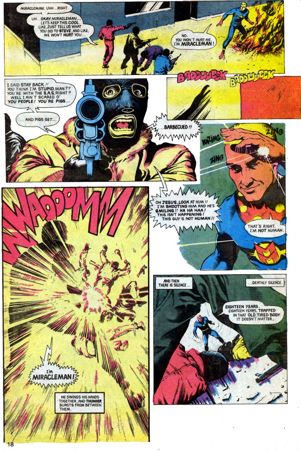 Pouco tempo, mas o suficiente para os leitores do passado também verem o retorno do Kid Miracleman, agora um adulto sociopata que mantinha todos os poderes do passado. Era o sidekick que havia se tornado um vilão, algo ainda inédito nos gibis. A violência visual também era bem marcante, com o protagonista matando assaltantes carbonizados, por exemplo.