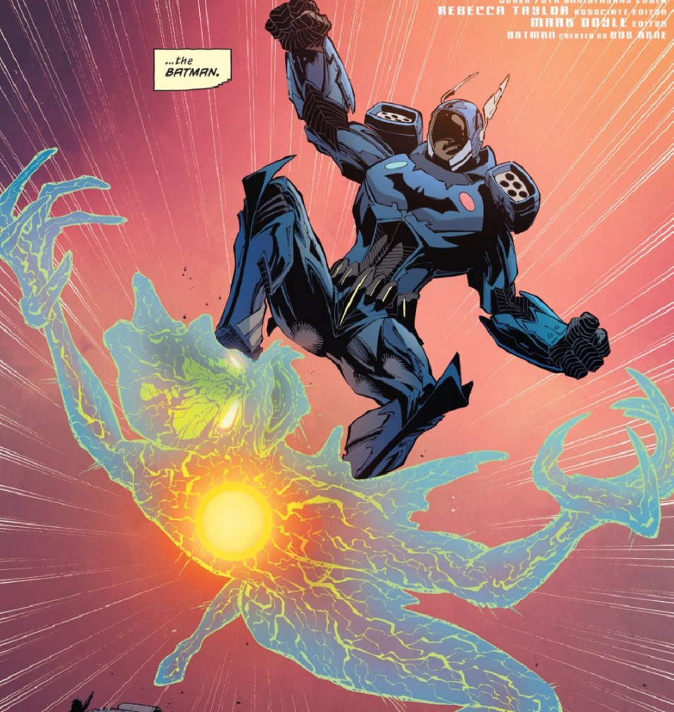 Ok, essa armadura não tem o visual mais lindo do mundo. Parece um coelho – comentário feito pelo próprio Jimbo na história. Como o todo, esse detalhe faz sentido: não temos ninguém envolvido com o “Batman anterior” nesse novo projeto. Por mais que a Wayne Enterprises também faça parte da bagaça, são pessoas que nunca entraram na cabeça de Bruce Wayne, que nunca entenderam seus objetivos, suas inspirações. São técnicos e até um designer que, sei lá, querem fazer algo cool.